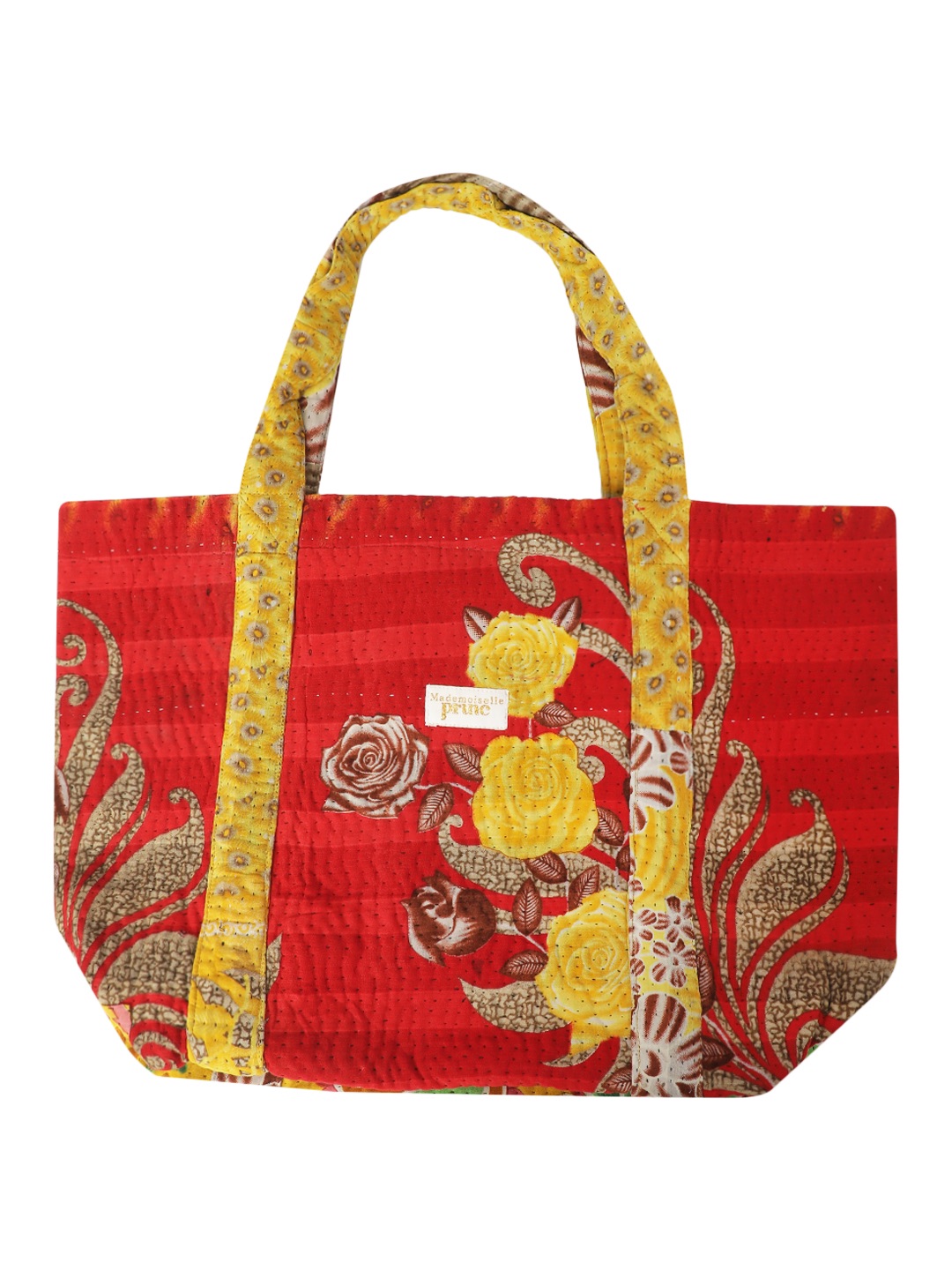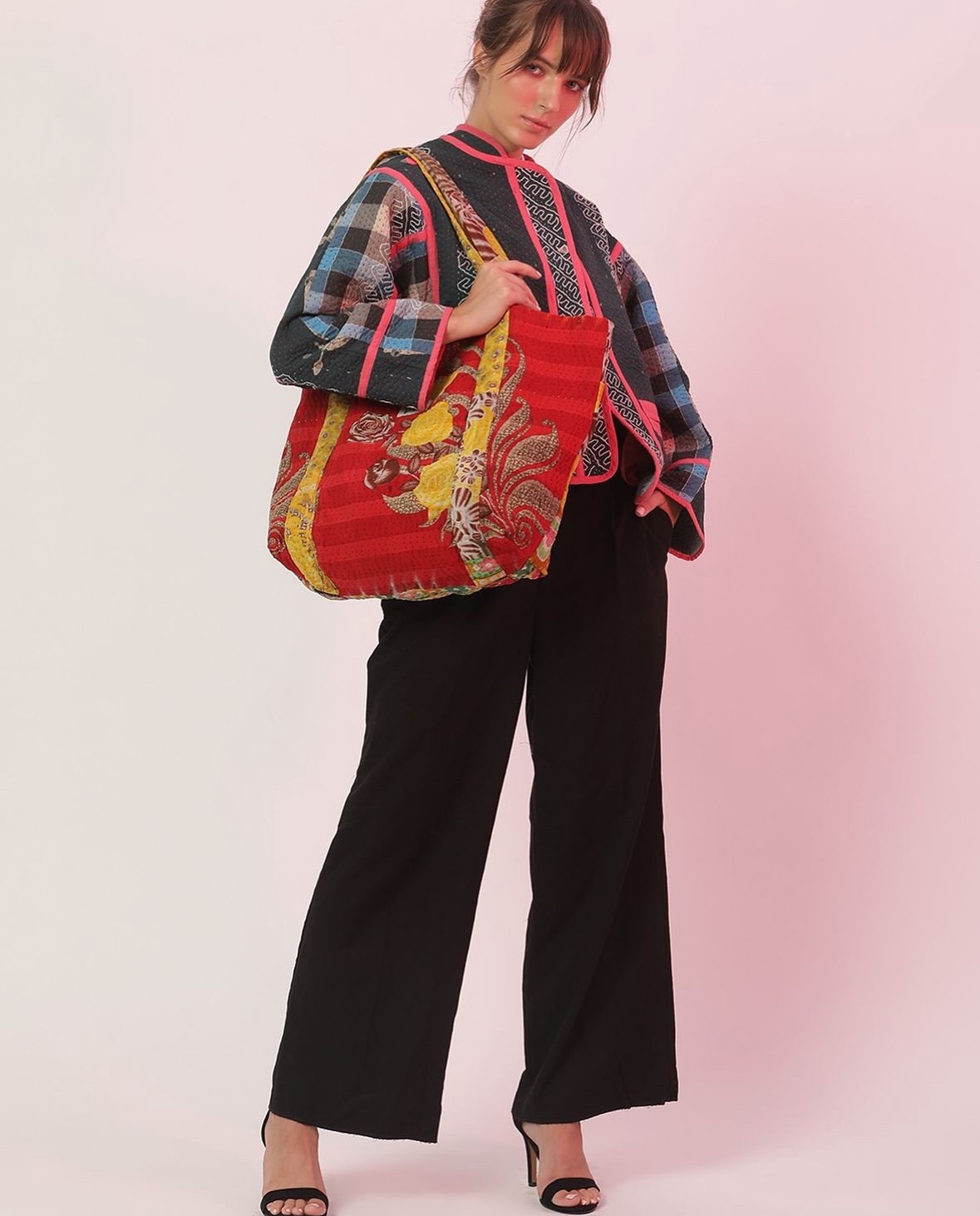Made from heritage kantha textile, each bag is one-of-a-kind. Each piece is unique and has been designed using the kantha embroidery technique, creatively up-cycling old cotton saris, giving them a new life as fashion accessories.